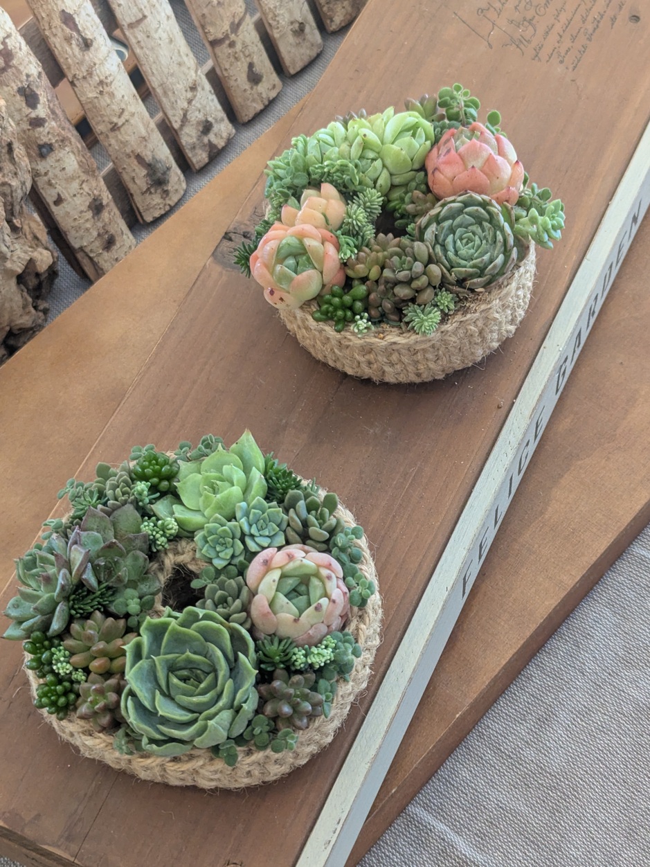 麻のナチュラルリースを使った寄せ植えの講座です。大きいもの、小さいもの、ほんのり赤いものなど、多種多様な多肉を寄せ植えると、まるで花のリースのような美しさです。